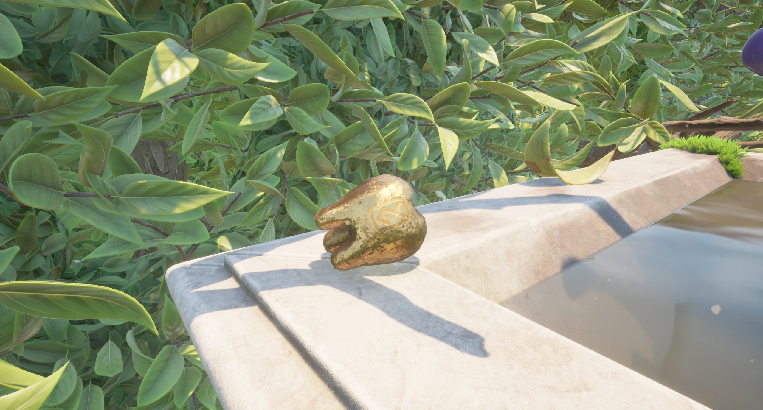 Inside the stone wall around the pond, on the right-most corner via a crevice under the upper stones. |