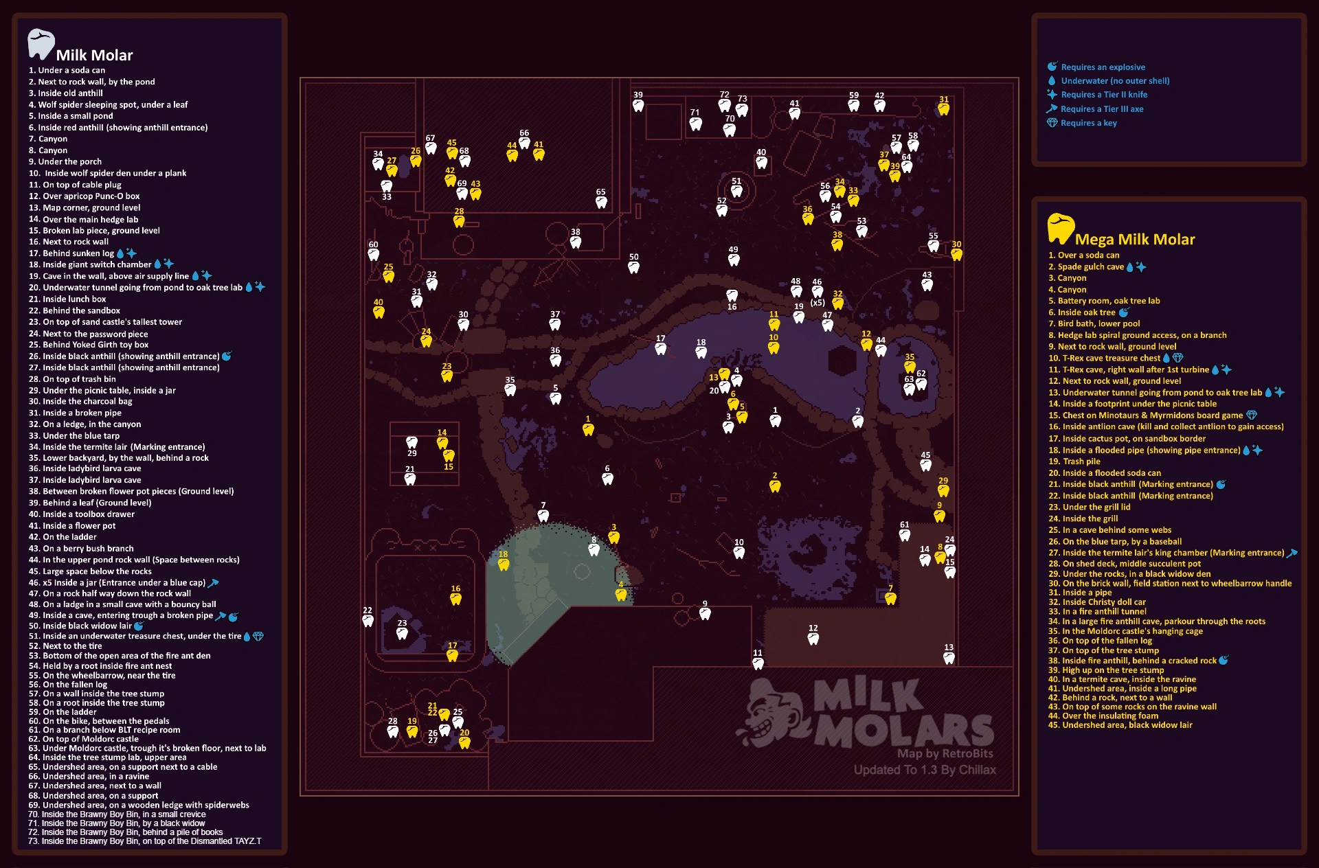 This is the map of every Milk Molar and Mega Milk Molar currently collectable in the game. Contributed by community member, RetroBits. Updated to Version 1.2 by Chillax. Updated to Version 1.3 by Weevil Wrangler.