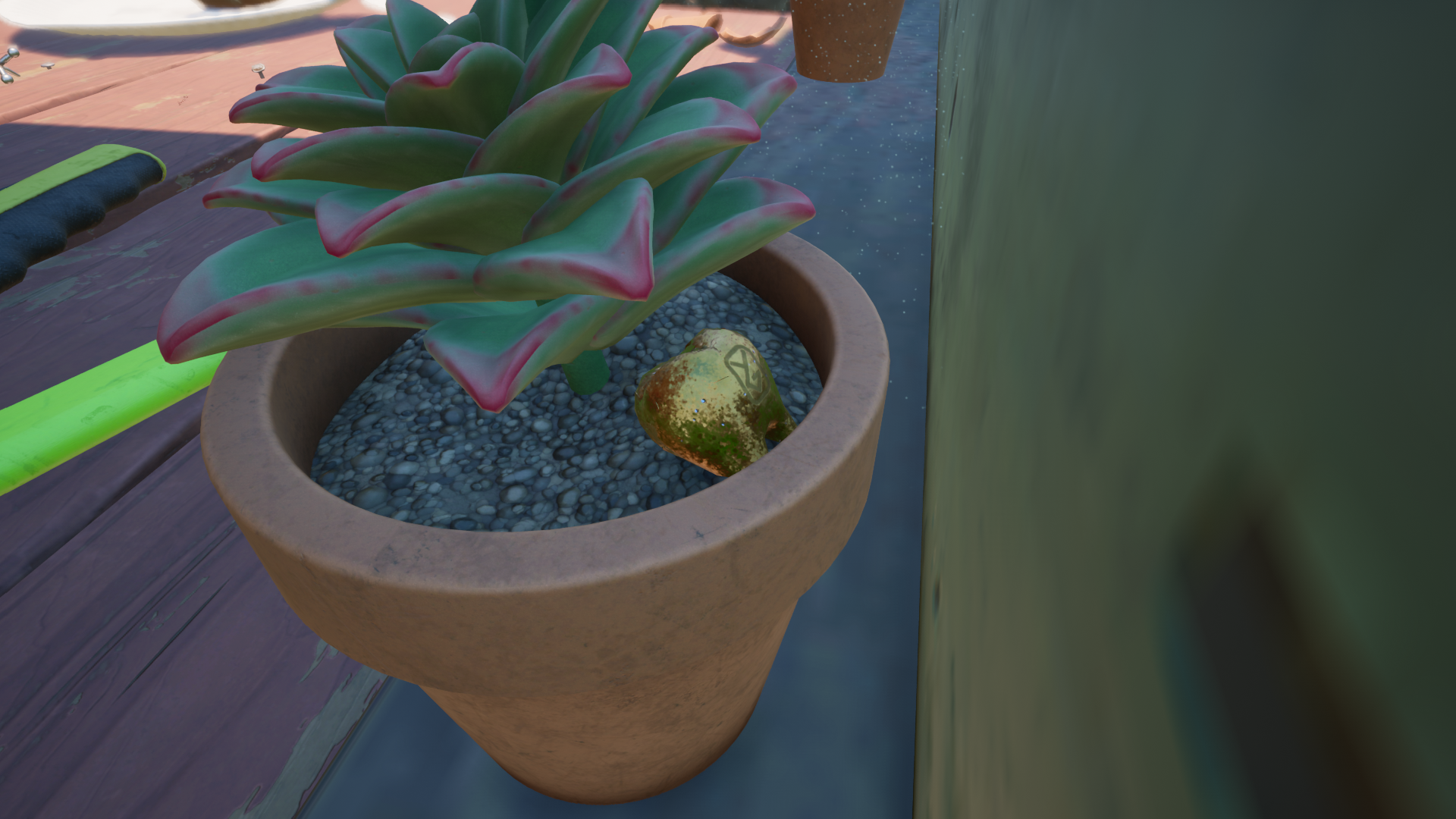 Inside a plant pot at the back of the sheds deck that has to be built up to or glided to. |