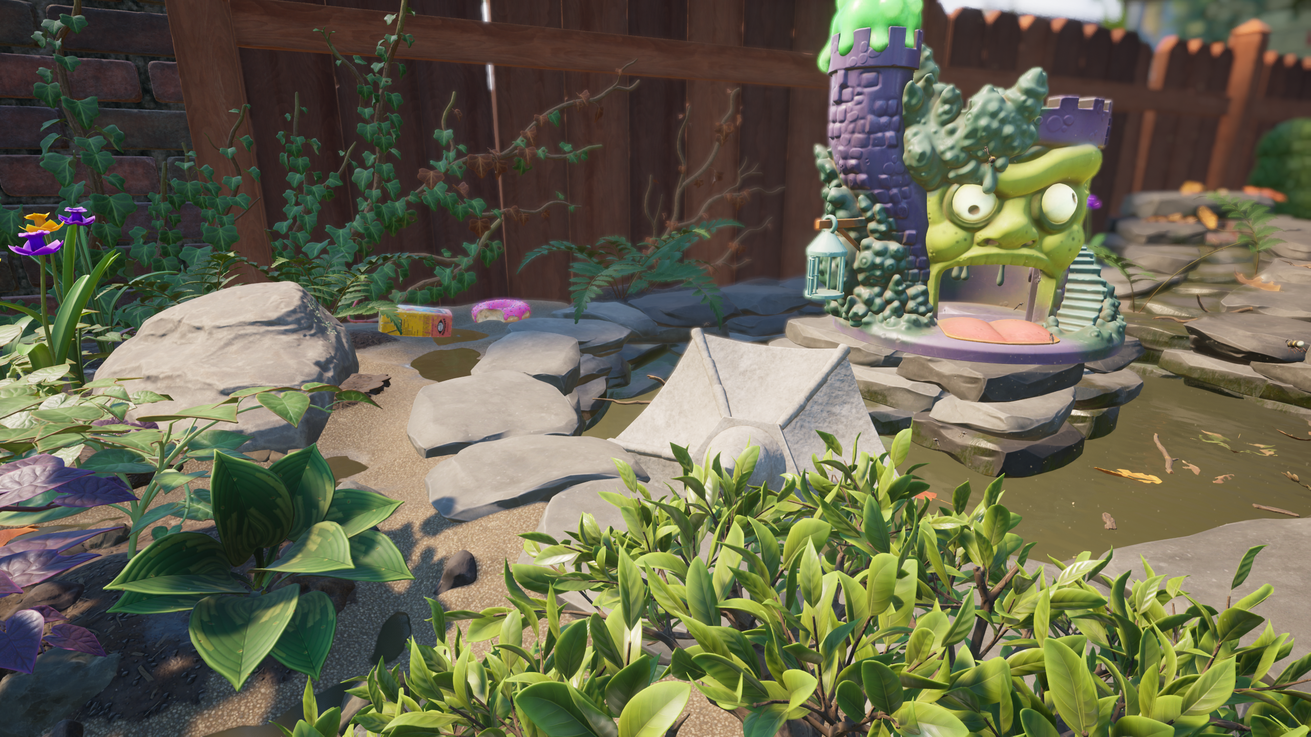 The north portion of the highlands is a fairly flat and open space, filled with small Berry bushes. A MIX.R and a Small Wasp Hive is also located here. The spot becomes full of infected if the Weedkiller is sealed. The main point of interest in the area is the Castle Moldorc Playset, located in the center of the area around a moat. In this moat are tons of Spiny Water Fleas and Pond Moss for harvesting. As well as this, multiple Tiger Mosquitos patrol the skies of this pond, making it very dangerous to be near. The south section of the area is mostly filled with large stones and a rusty once water fall. Below these stones is also a Black Widow the player needs to be aware of when traveling to the area. A pair of Black Ox Beetles can also be found below the rocks, through an entrance near the top of the broken water dispenser.